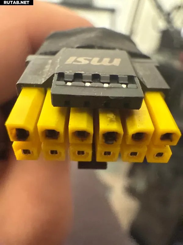 Третий случай: MSI RTX 5090 Ventus. Использовалась с блоком питания Corsair 1200W и фирменным переходником с четырьмя 8-контактными разъемами на один 16-контактный. Владелец применял ручное понижение напряжения, обычное энергопотребление составляло около 450 Вт, в основном при обычных играх. Несмотря на это, разъем все равно сгорел.