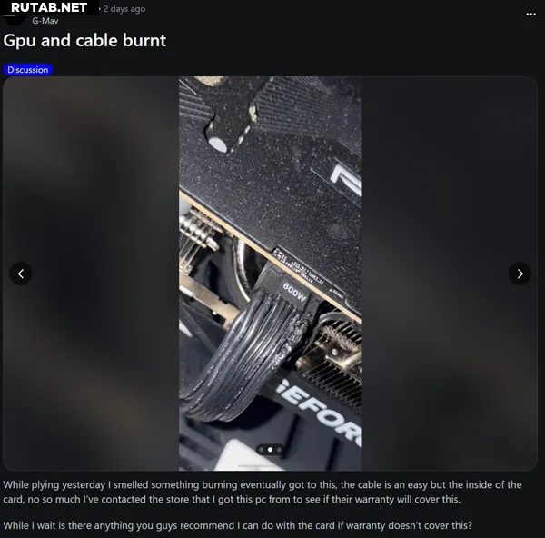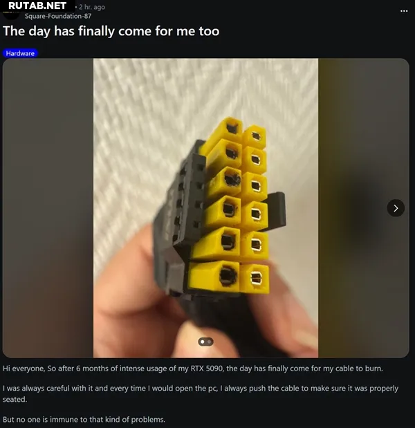Всего за последние 48 часов на форуме Reddit появилось четыре сообщения от пользователей, у которых сгорел 16-контактный разъем питания или кабель питания на видеокартах RTX 5090.