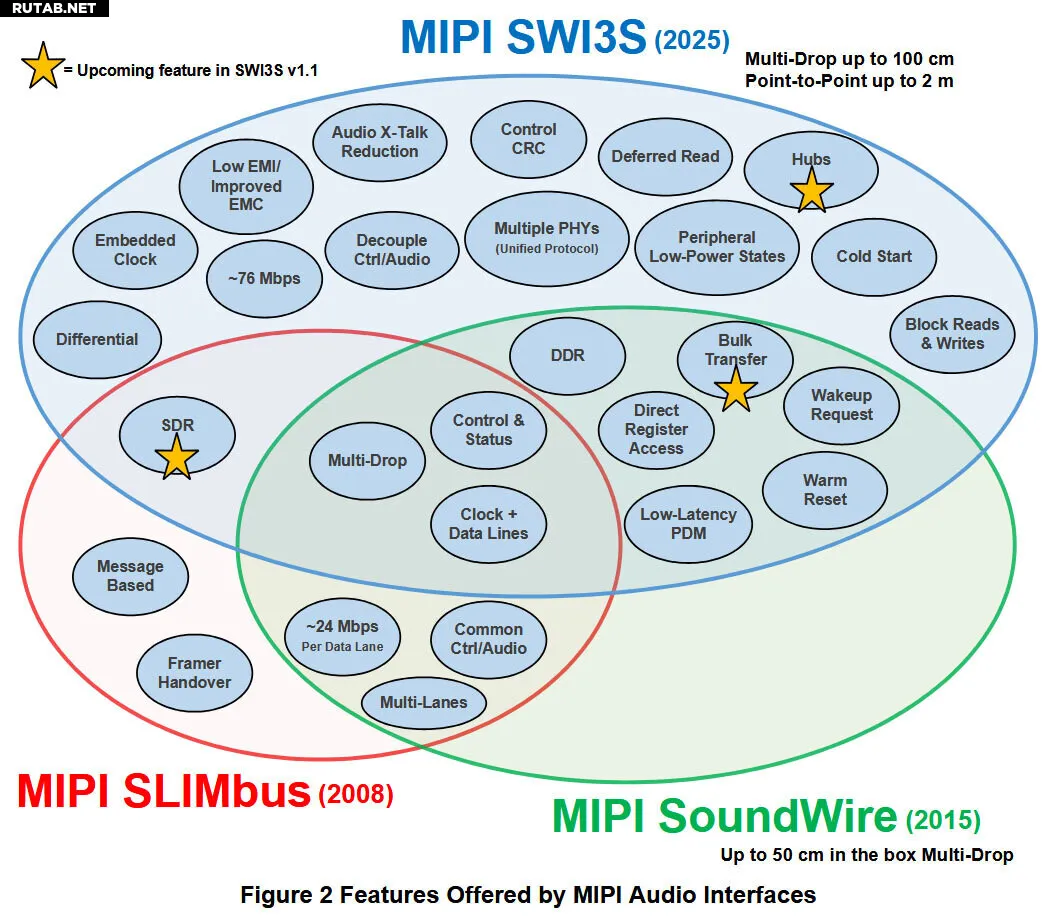 Потребительская электроника, автомобильная и промышленная техника всё чаще требуют более сложных аудиовозможностей в меньших, более плотных и многофункциональных устройствах, где электромагнитные помехи (EMI), энергопотребление и пространство являются критически важными ограничениями. Устаревшие аудиоинтерфейсы, такие как I2S или TDM, не справляются с этими требованиями при использовании длинных проводников или гибких кабелей. SWI3S развивает двухконтактную многоточечную архитектуру MIPI SoundWire, предлагая более высокую пропускную способность, низкое энергопотребление и встроенную поддержку масштабируемых топологий для нескольких устройств, чтобы удовлетворить растущие потребности современных аудиосистем.