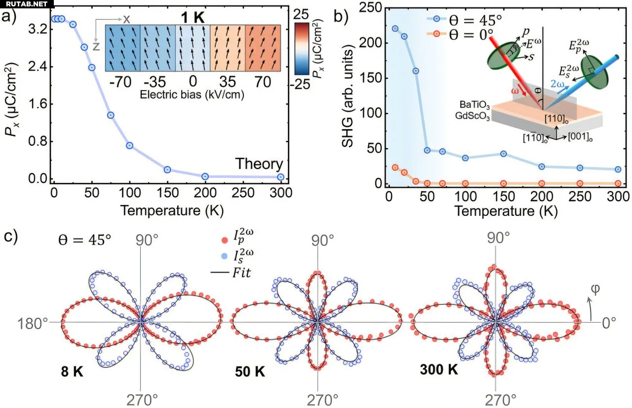 a) Фазовое моделирование значений in-plane поляризации. b) Сигнал генерации второй гармоники в зависимости от температуры. c) SHG-поляриметрия, указывающая на симметрию. Автор: Advanced Materials (2025). DOI: 10.1002/adma.202507564
