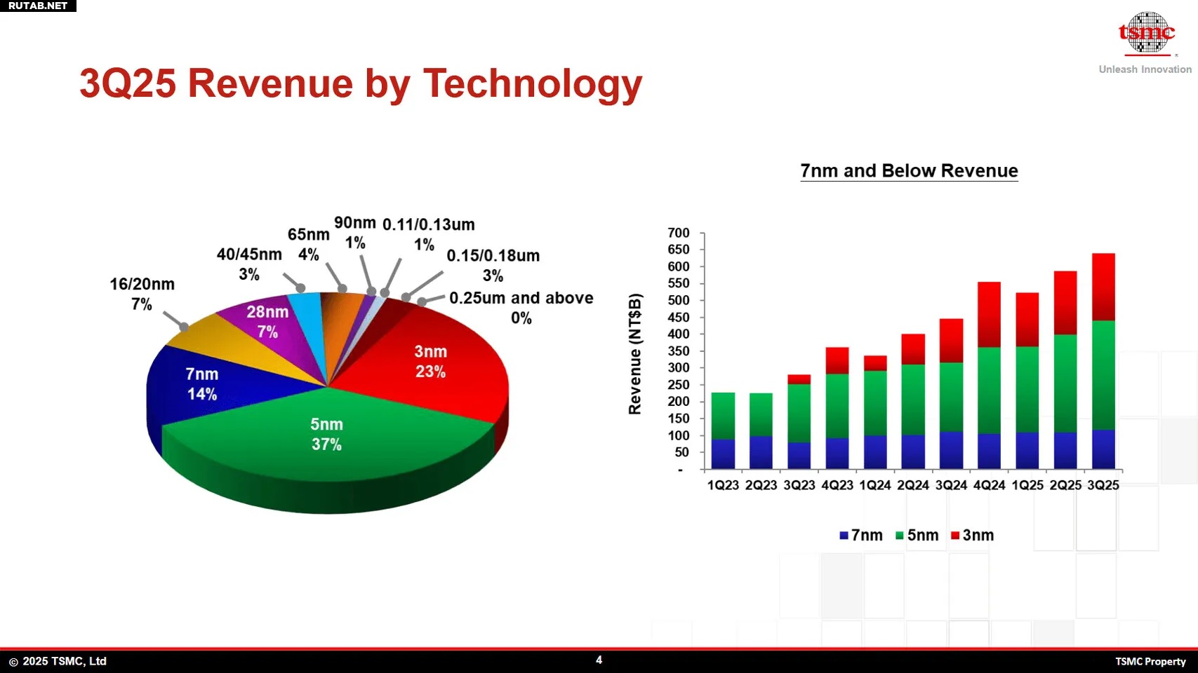 В третьем квартале TSMC обработала ошеломляющие 4,085 миллиона 300-мм пластин, что примерно на 22,4% больше, чем за аналогичный период годом ранее. Выручка от передовых технологических процессов, включая все варианты N3, N5 и N7, теперь составляет примерно 74% от общего объёма продаж. По каждому узлу: поставки по процессу N3 составили 23% от выручки с пластин, N5 — 37%, а N7 — 14%. Семейство N5 показало наибольший рост продаж, что отражает интенсивный спрос на AI-ускорители и другие высокопроизводительные устройства. Также стоит отметить, что каждый узел имеет разную ценовую стратегию, причём новые узлы значительно дороже из-за более совершенных и сложных производственных технологий.