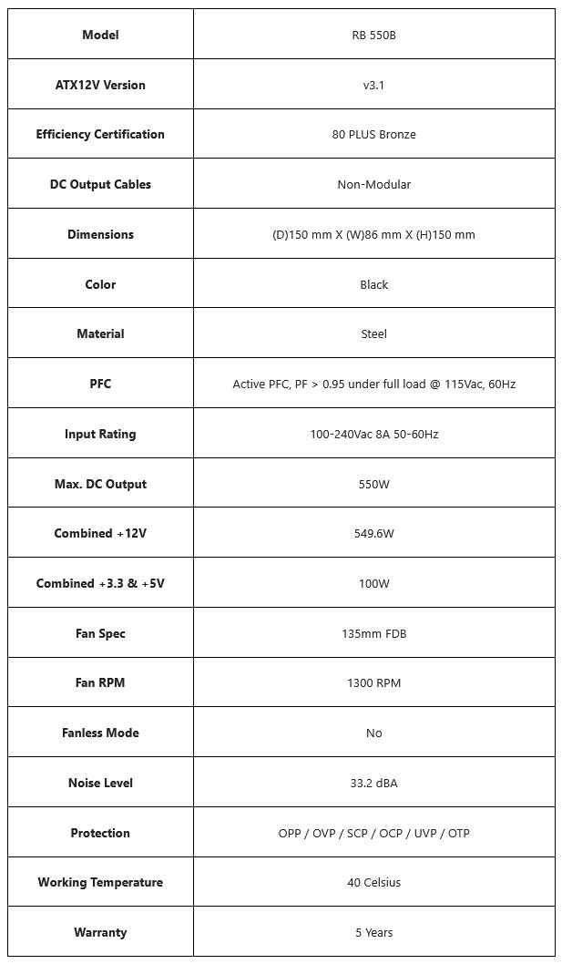 Для поддержания низкого уровня шума без ущерба для тепловых характеристик серия RB оснащена 135-мм вентилятором на гидродинамических подшипниках. Работая всего при 33,2 дБА до 40,1 дБА в зависимости от модели, вентилятор обеспечивает тихую работу даже при полной нагрузке. Каждый блок сертифицирован 80 Plus Bronze с эффективностью до 85%, что снижает потери энергии и тепловыделение. При поддержке непрерывной работы при полной нагрузке при температуре окружающей среды до 40°C, а также со встроенными защитами (OPP, OVP, SCP, OCP, UVP и OTP), серия RB предлагает как надёжную производительность, так и спокойствие пользователя.