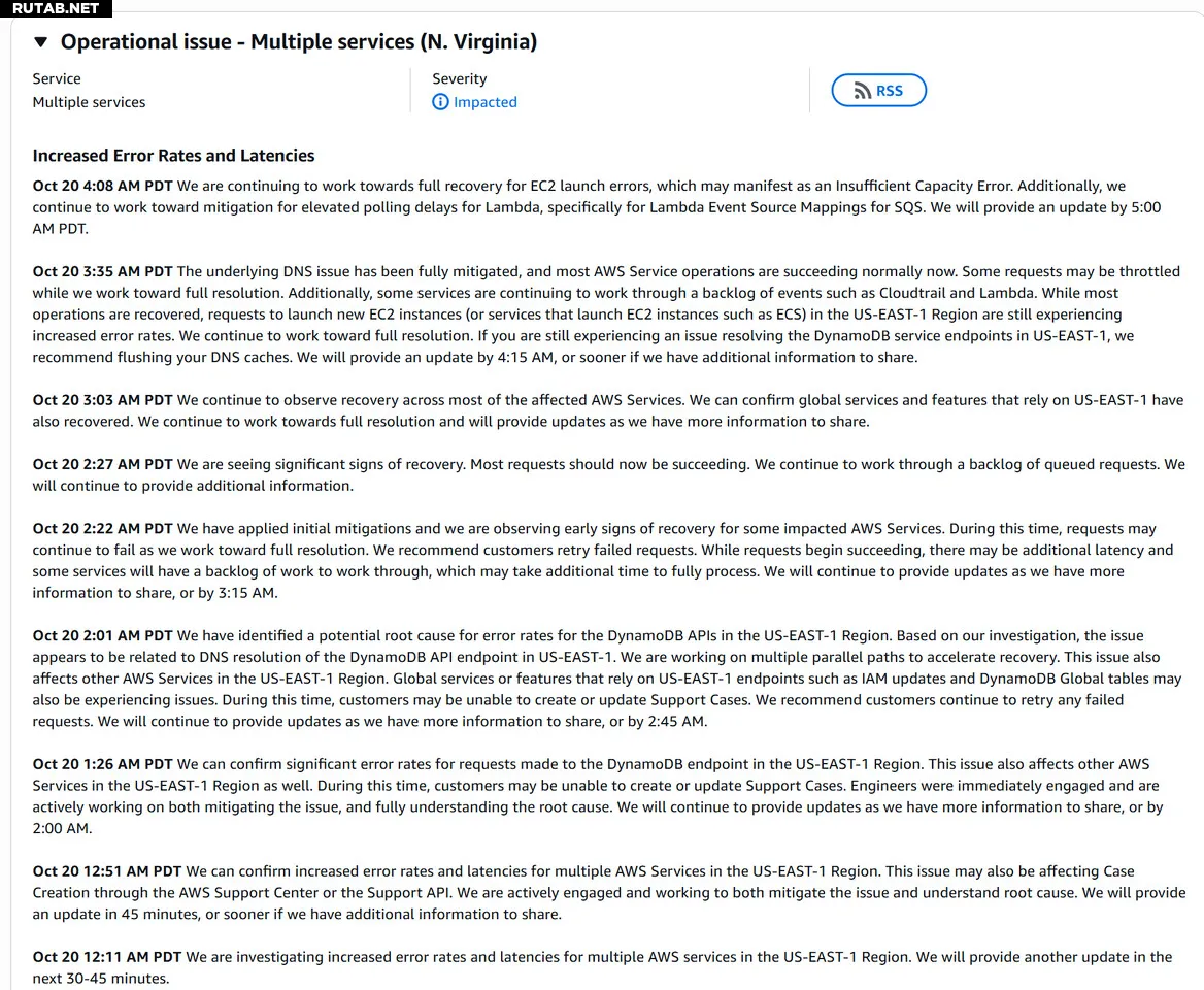 «Мы расследуем повышенные показатели ошибок и задержек для нескольких сервисов AWS в регионе US-EAST-1».