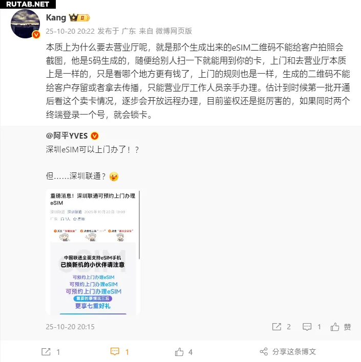 Компания China Unicom в Шэньчжэне предложила решение этой проблемы, запустив услугу выездного подключения eSIM. Теперь абоненты могут заполнить онлайн-заявку на официальном сайте, после чего сотрудник компании приедет по указанному адресу в течение 24 часов и активирует eSIM прямо на месте.