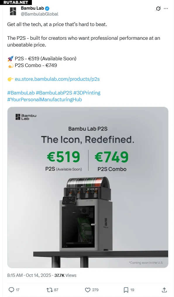 Журналисты связались с Bambu Lab и попросили обновить информацию о доставке. Им сообщили, что компания не знает, когда сможет отправить устройства на свои склады в США. В X принтер рекламируется с ценником в евро, что несколько шокирует американское восприятие. Крошечная серая сноска объявляет, что устройство «скоро появится» в США.
