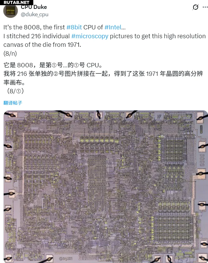 Энтузиаст под ником CPU Duke создал самую детальную и чёткую фотографию кристалла легендарного процессора Intel 8008, объединив 216 отдельных микрофотографий.