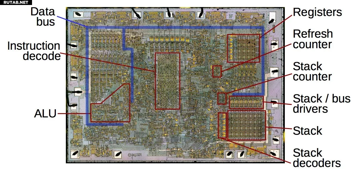 Хотя итоговое составное изображение чёрно-белое, сопоставление с ранним анализом чипа 8008, опубликованным Кеном Ширриффом (Ken Shirriff), позволяет энтузиастам идентифицировать области, соответствующие ключевым функциональным блокам: АЛУ, регистрам, счётчику стека, шине данных и другим.