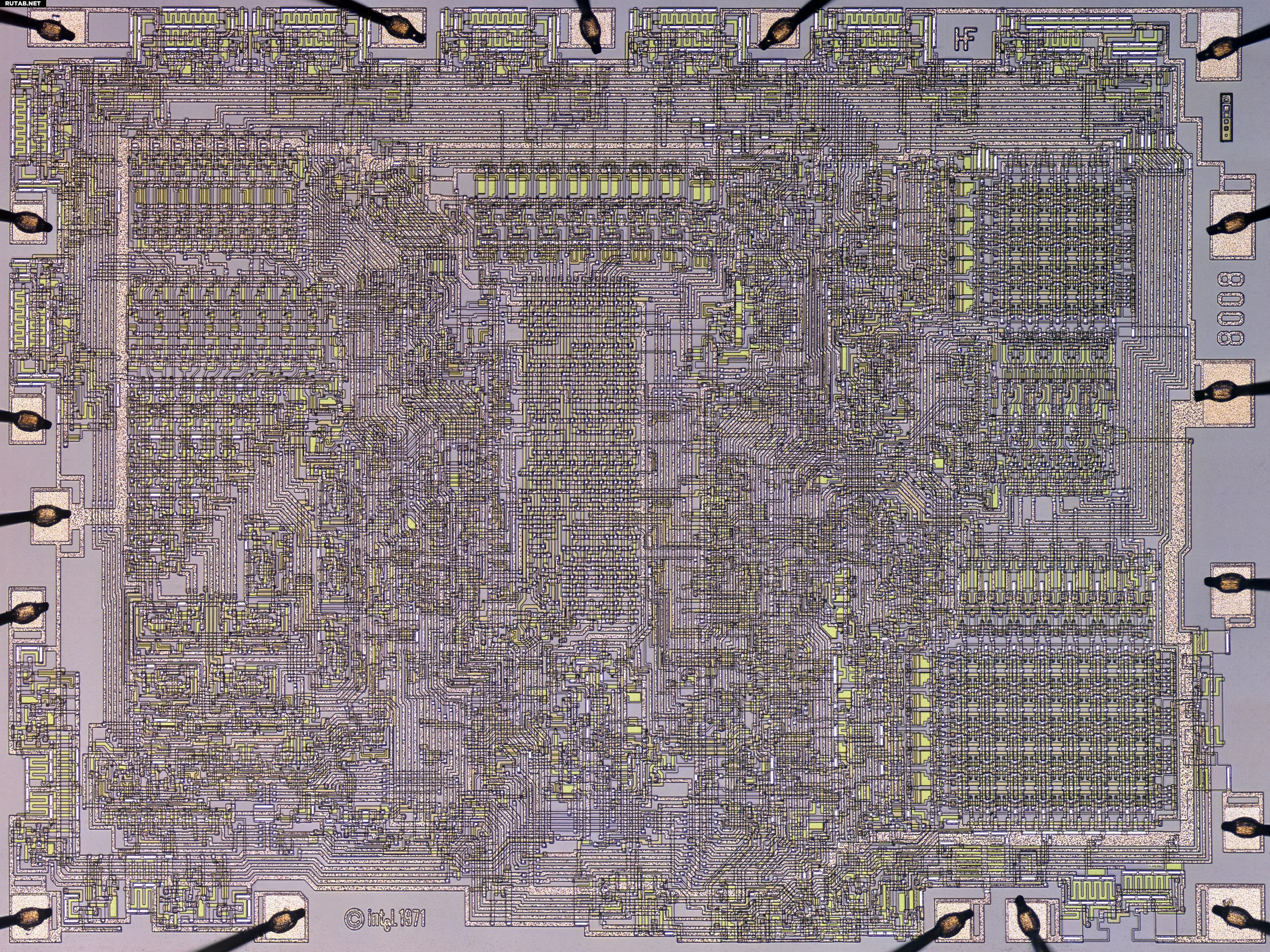 CPU Duke отметил, что из-за крупных размеров 10-микронных PMOS-структур «оптическая микроскопия всё ещё применима». Даже без сильного увеличения невооружённым глазом можно чётко разглядеть 18 контактных площадок чипа и разъёма, а также маркировки на кремнии: Intel 1971, 8008 и HF. Последняя является данью уважения Хэлу Фрини (Hal Freeny), члену команды разработчиков i8008.