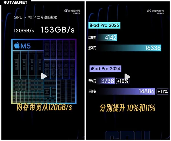 Что касается характеристик, чип M5, впервые устанавливаемый в iPad Pro, оснащен 10-ядерным CPU и 10-ядерным GPU. В блок GPU добавлен нейронный ускоритель, а пропускная способность памяти увеличена со 120 ГБ/с до 153 ГБ/с.