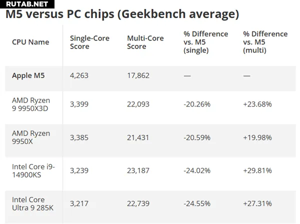 Кроме того, в тесте GeekBench (AppleBench) одноядерный процессор Apple M5 набрал 4263 балла, что также значительно превышает результаты топовых продуктов: Ryzen 9 9950X3D (3399 баллов), i9-14900KS (3239 баллов), Core Ultra 9 285K (3217 баллов).