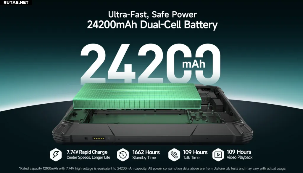 Планшет питается от огромной батареи ёмкостью 24 200 мА·ч, которая является самой большой в своём классе. Она поддерживает сверхбыструю зарядку мощностью 120 Вт, позволяя зарядить устройство до 20% всего за 10 минут. Armor Pad 5 также может работать как портативный аккумулятор с обратной зарядкой мощностью 10 Вт, что идеально подходит для использования на природе.