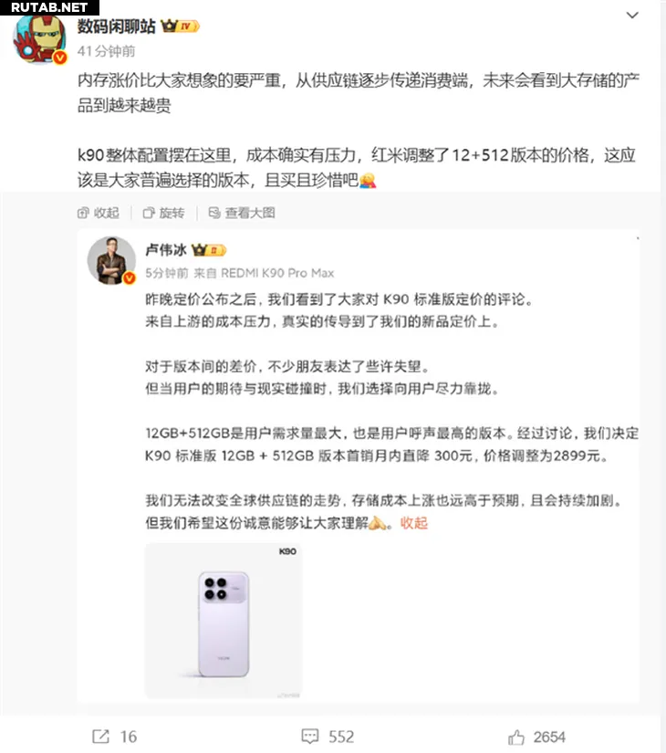 Думаете, от этого страдают только владельцы настольных ПК? Владельцам смартфонов тоже не стоит радоваться. Флагманская память LPDDR5X также стремительно дорожает. Возьмем, к примеру, только что выпущенный REDMI K90: хотя при запуске его цена сразу снизилась на 300 юаней, это стало возможным благодаря тому, что Xiaomi «стиснула зубы и предоставила субсидии». Лэй Цзюнь лично написал в Weibo: «В последнее время память подорожала действительно очень сильно, надеюсь, вы оцените нашу искренность».