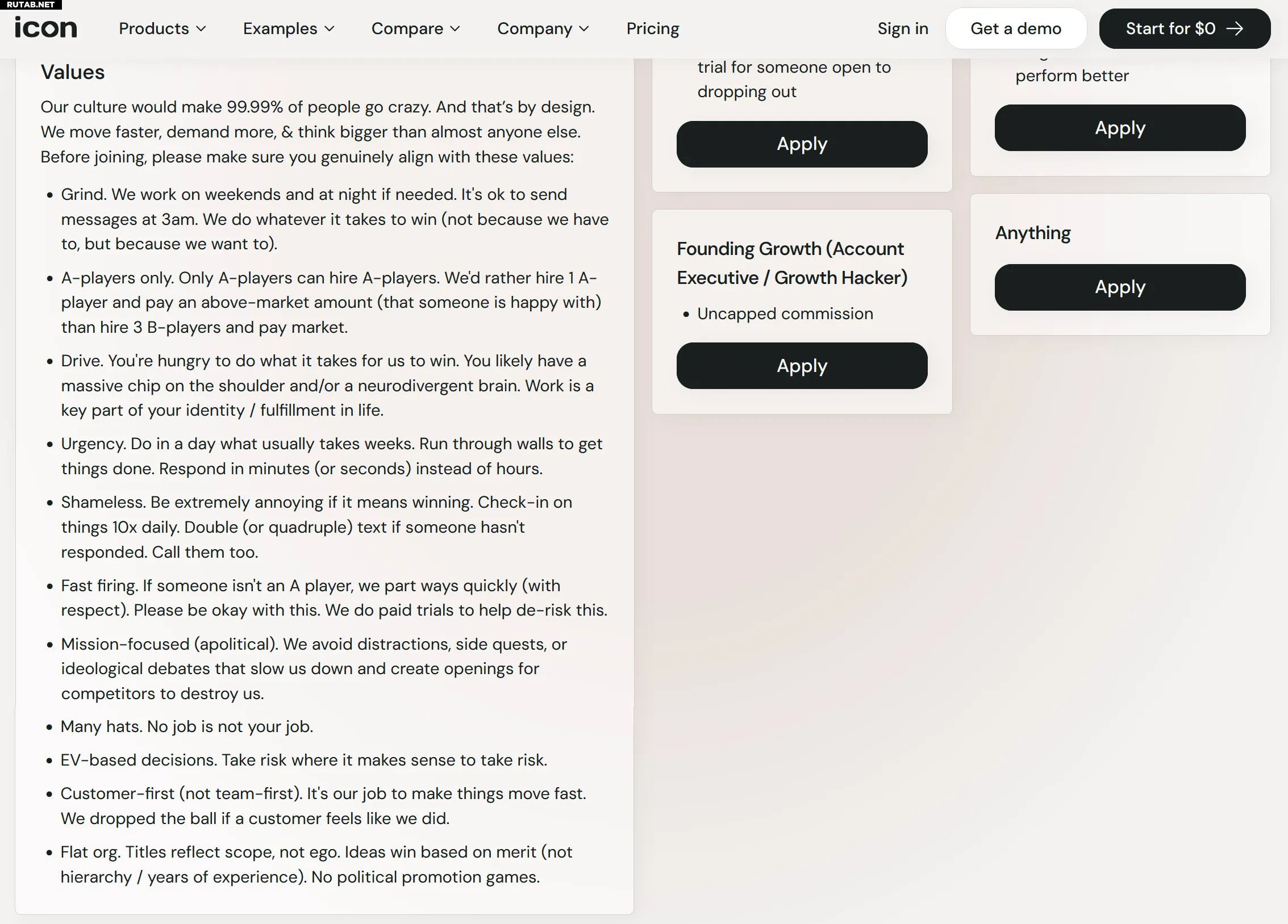 Кандидатов также предупреждают, что от них могут потребовать «проламывать стены, чтобы добиться результата... [и] быть чрезвычайно надоедливыми, если это ведёт к победе». Не совсем понятно, как сотрудники смогут поддерживать такой уровень энергии, если от них также ожидается присутствие в офисе «по выходным и ночью при необходимости. [и] Нормально отправлять сообщения в 3 часа ночи». Разумеется, для слабаков, предпочитающих удалённую работу, в Icon.com места нет, ведь «Работа — это ключевая часть вашей идентичности/самореализации в жизни».