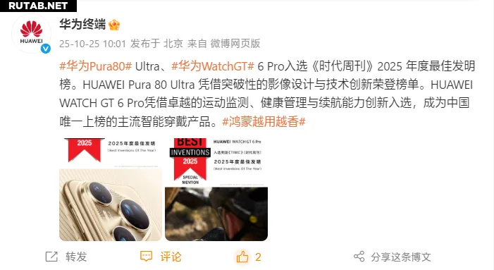 Компания Huawei сообщила, что её флагманский смартфон Pura 80 Ultra и умные часы Watch GT 6 Pro вошли в список лучших изобретений 2025 года по версии журнала Time.