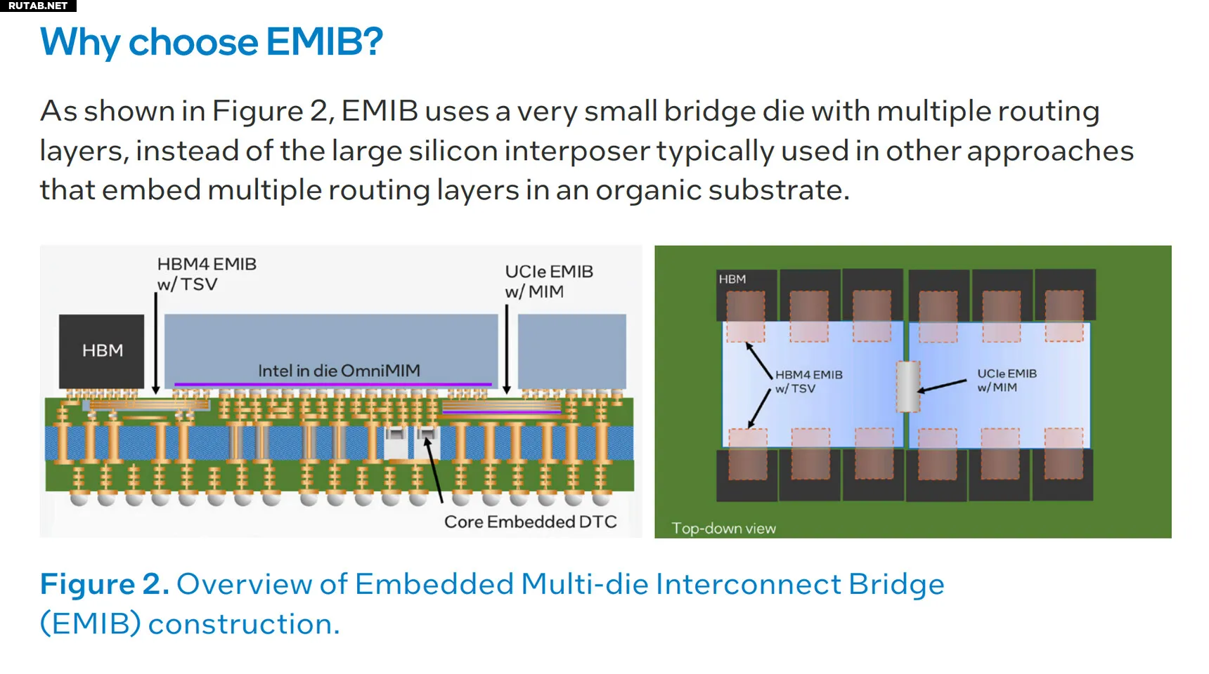 Портфолио Intel Foundry включает технологии 2D, 2.5D и 3D упаковки, позволяющие оптимизировать стоимость, энергопотребление и пропускную способность. Технология EMIB представляет собой кремниевый мост, встроенный в подложку, обеспечивающий высокую плотность соединений между кристаллами без дорогостоящего кремниевого интерпозитора.