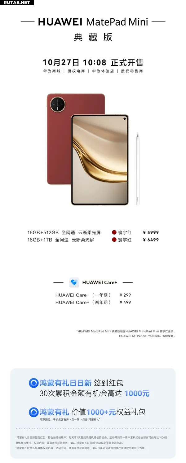 Компания Huawei представила новый компактный планшет MatePad Mini Collector's Edition, который поступил в продажу 27 октября. Модель с памятью 16 ГБ + 512 ГБ и экраном Cloud Clear Soft Light стоит 5999 юаней, а версия с 1 ТБ памяти — 6999 юаней.
