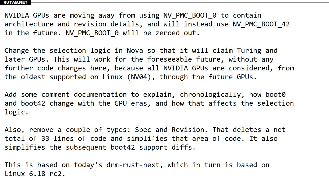 В патчах также добавлены комментарии, документирующие эволюцию BOOT_0 и BOOT_42 в разных поколениях GPU, и удалены несколько устаревших типов — Spec и Revision. Согласно примечаниям, это упрощение устраняет некоторую сложность и облегчает отслеживание будущих обновлений поддержки boot42, избегая специфических для поколения корректировок при появлении новых ревизий.
