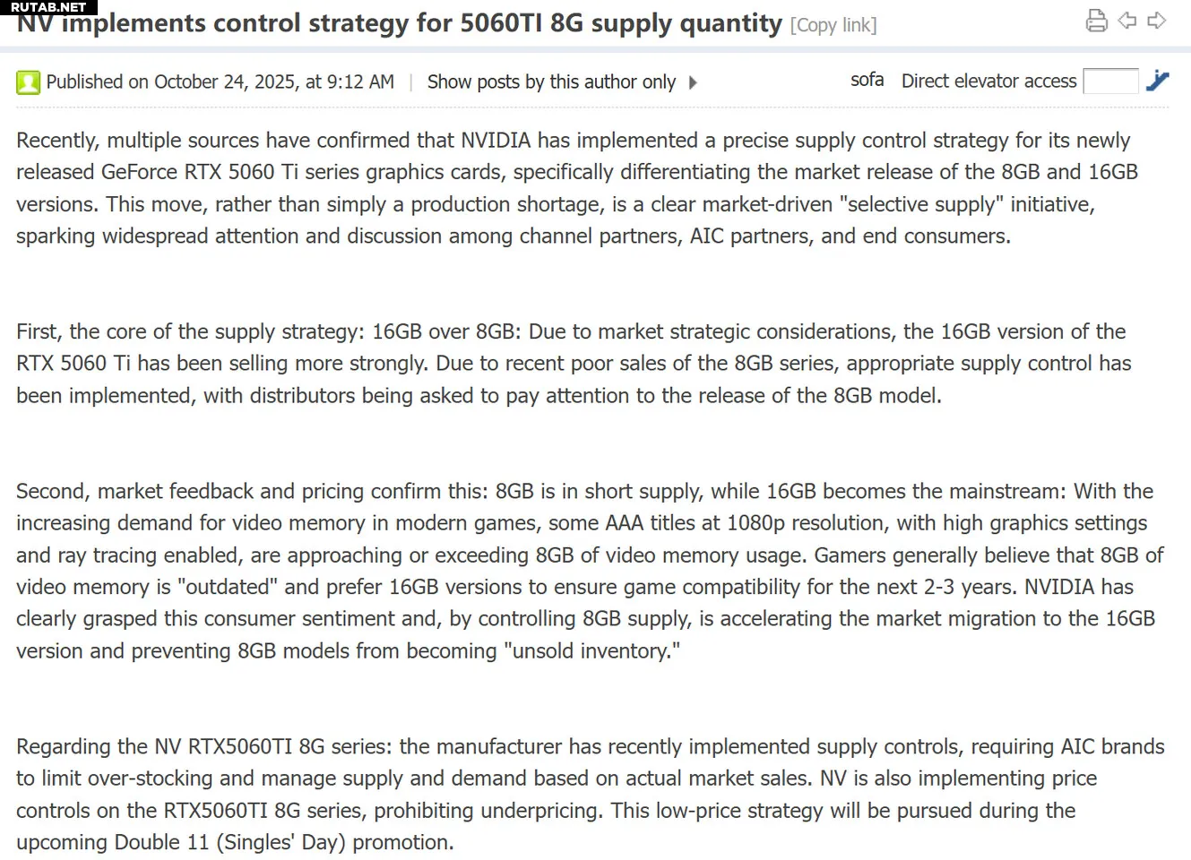 NVIDIA приказала партнерам сосредоточиться на выпуске RTX 5060 Ti с 16 ГБ памяти