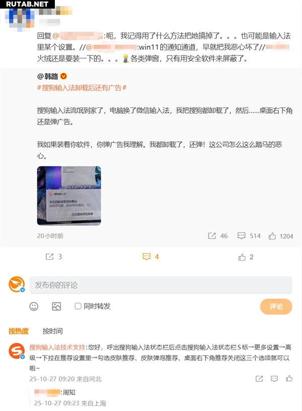 Хань Лу написал: «На компьютере я перешел на ввод WeChat, удалил Sogou, и... реклама все равно всплывает в правом нижнем углу экрана. Если бы программа была установлена, я бы понял появление рекламы. Но я же ее удалил!»