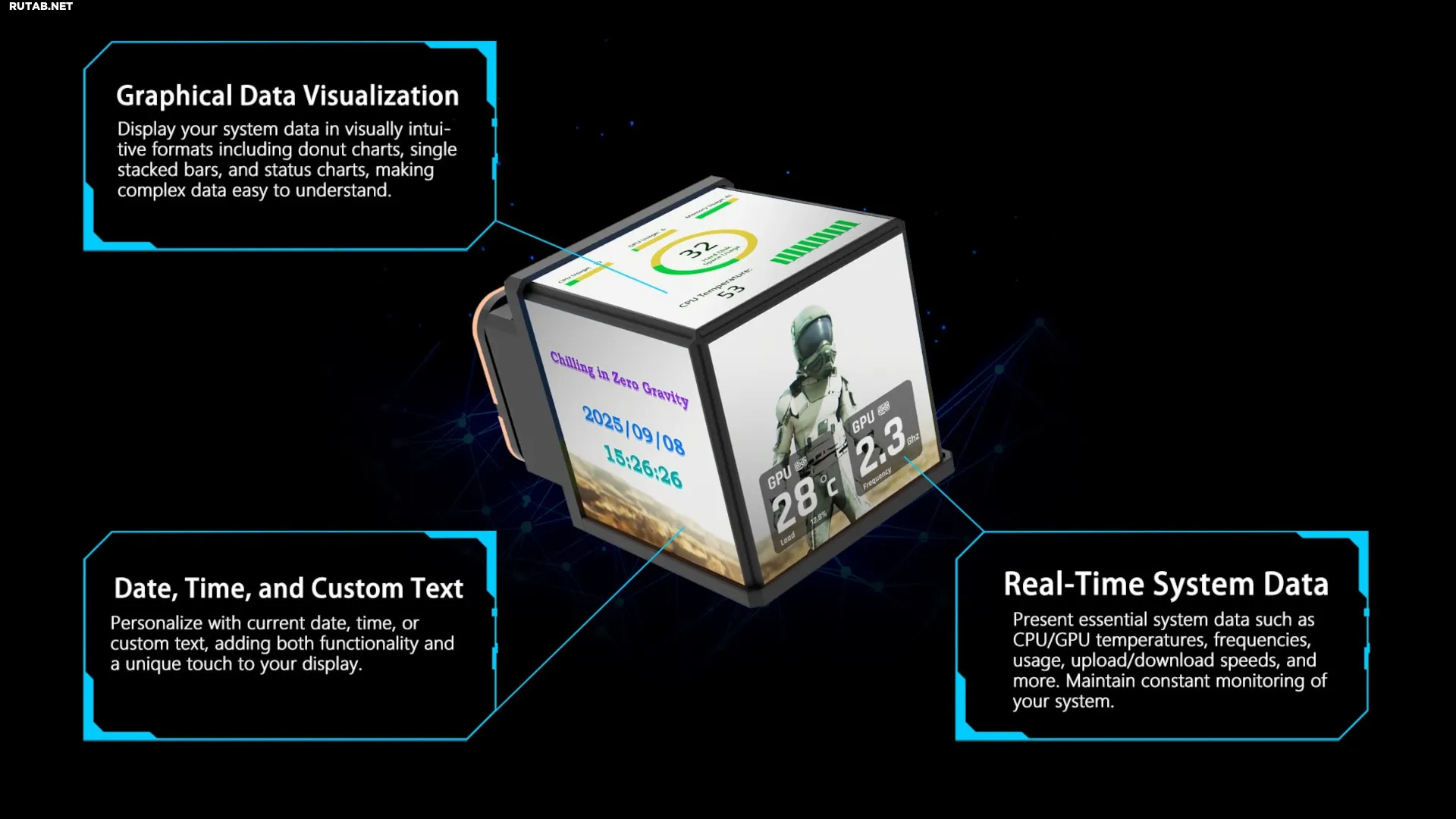 В то время как большинство производителей ограничиваются одним ЖК-экраном на помпе, Thermaltake оснастила Minecube целыми четырьмя отдельными дисплеями: один смотрит прямо вверх, а остальные три образуют «обёртывающий» эффект, начинаясь со стороны задней панели ввода-вывода материнской платы и заканчиваясь у слотов оперативной памяти.