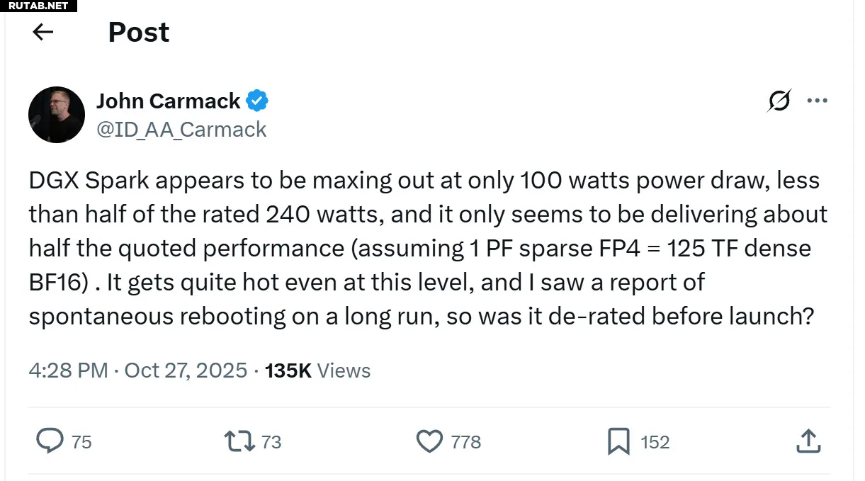 Система NVIDIA DGX Spark, созданная как идеальное решение для локального и быстрого прототипирования ИИ, по сообщениям, работает на половине ожидаемой мощности и производительности. Джон Кармак, основатель компании Keen Technologies, ориентированной на ИИ, и бывший технический директор Oculus VR, утверждает, что мини-ПК DGX Spark не соответствует заявленным характеристикам. NVIDIA указывает, что система DGX Spark потребляет 240 Вт, однако тесты Кармака показывают, что устройство потребляет лишь около 100 Вт, что фактически вдвое снижает энергопотребление и производительность.