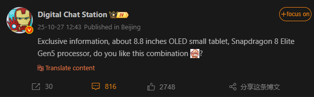 Надёжный инсайдер с Weibo Digital Chat Station сообщает, что Oppo разрабатывает флагманский планшет на базе процессора Qualcomm Snapdragon 8 Elite Gen 5 — той же 3-нанометровой платформы, которая дебютирует в таких телефонах, как OnePlus 15. Главная особенность? 8,8-дюймовый OLED-дисплей, сочетающий яркие цвета, глубокий чёрный и, вероятно, высокую частоту обновления для плавной прокрутки и игр. Этот компактный форм-фактор — по сравнению с 8,3 дюймами у iPad mini — позиционирует его как настоящее чудо для одной руки для пользователей Android, идеальное для заметок, чтения, игр или монтажа на ходу.