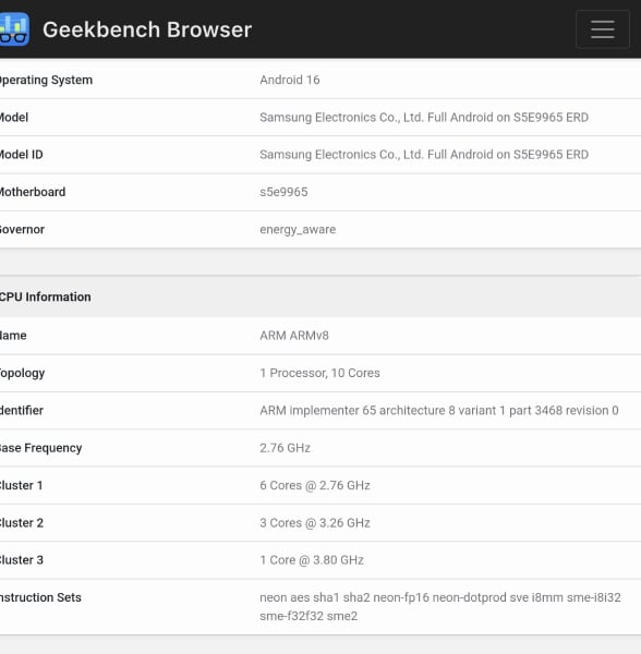 Интересно, что Samsung, возможно, работает над двумя версиями Exynos 2600. Вариант с более низкими тактовыми частотами также появился в Geekbench на прошлой неделе, показывая основное ядро на 3,55 ГГц, три производительных ядра на 2,96 ГГц и шесть энергоэффективных ядер на 2,46 ГГц. Неудивительно, что его результаты снизились до 3047 (однопоточный) и 10025 (многопоточный) баллов.