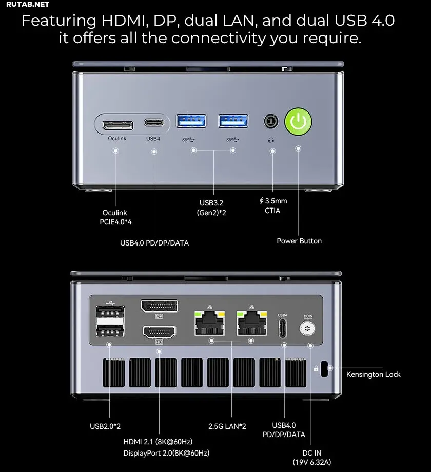 На передней панели расположены два порта USB 3.2 Gen 2, комбинированный аудиоразъем 3.5 мм, порт USB4 и разъем OCuLink. На задней панели находятся два порта USB 2.0, HDMI, DisplayPort, USB4, два сетевых порта и слот для замка безопасности. Система поставляется с предустановленной ОС Windows 11 Pro, а также поддерживает дистрибутивы Linux, такие как Ubuntu.