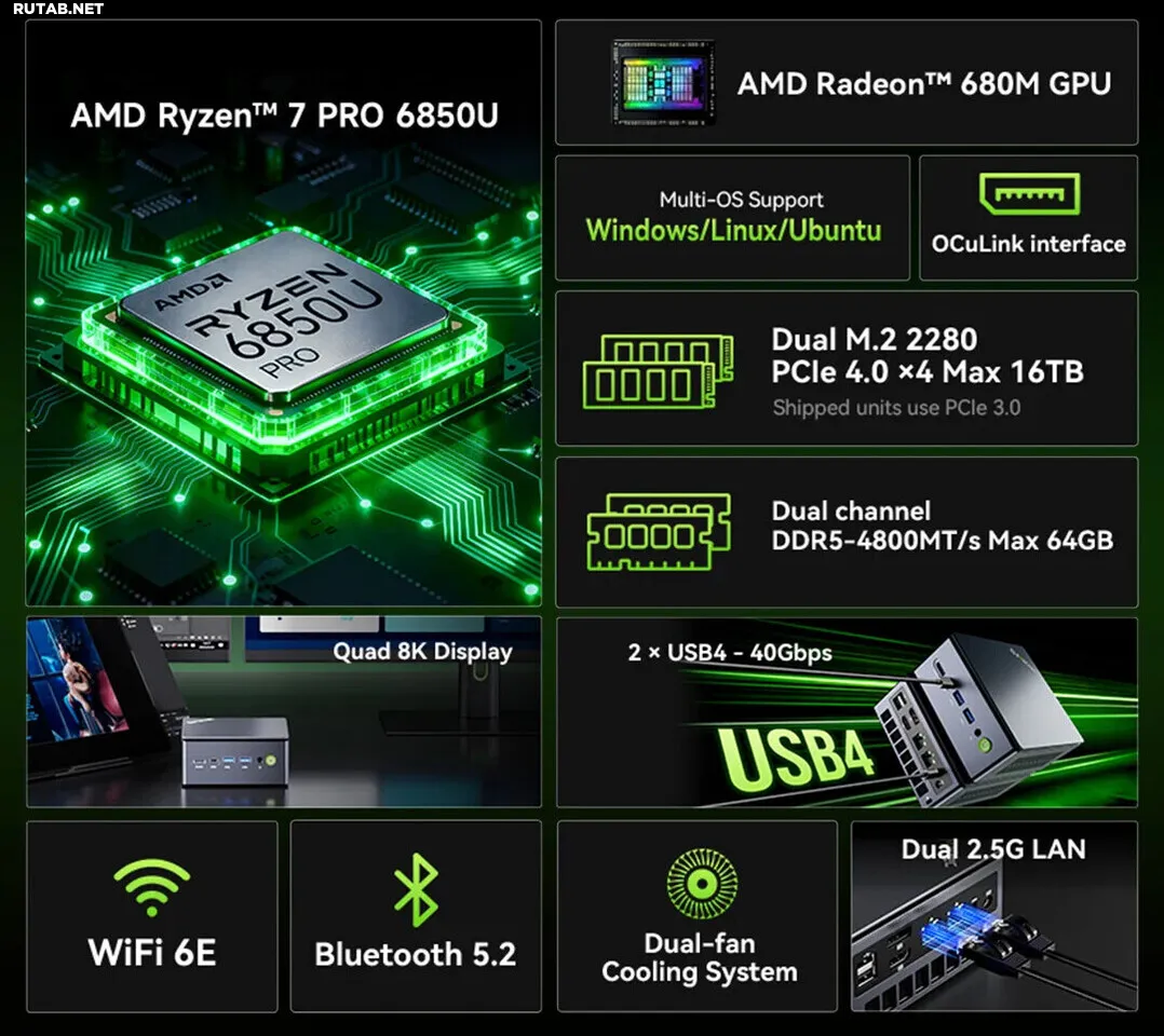 NucBox M7 Ultra поддерживает до 64 ГБ оперативной памяти DDR5-4800 и оснащена накопителями PCIe 4.0 M.2 с возможностью расширения до 16 ТБ (2 слота M.2 2280). Для подключения дисплеев доступны порты HDMI 2.1, DisplayPort 2.0 и два порта USB4, что позволяет выводить изображение в разрешении до 8K одновременно на четыре экрана. Беспроводные подключения обеспечиваются Wi-Fi 6E и Bluetooth 5.2, а проводные — двумя портами LAN 2.5 Гбит/с.