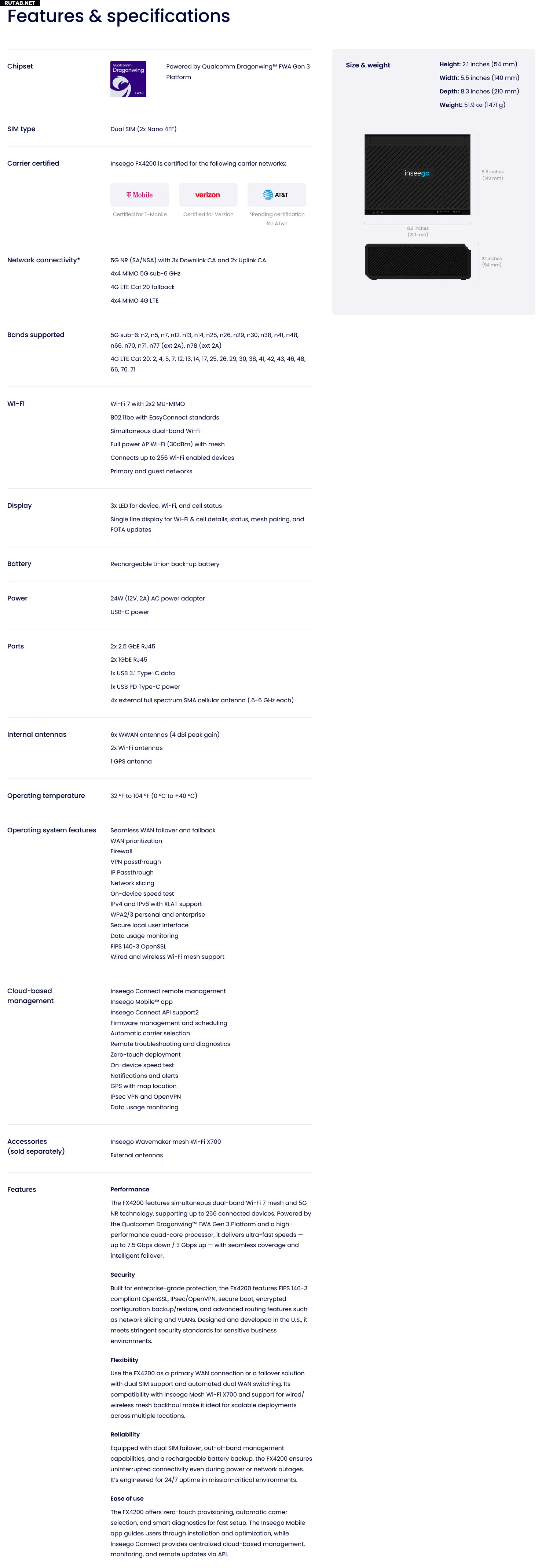 Маршрутизатор FX4200 построен на платформе Qualcomm Dragonwing FWA Gen 3 и поддерживает: