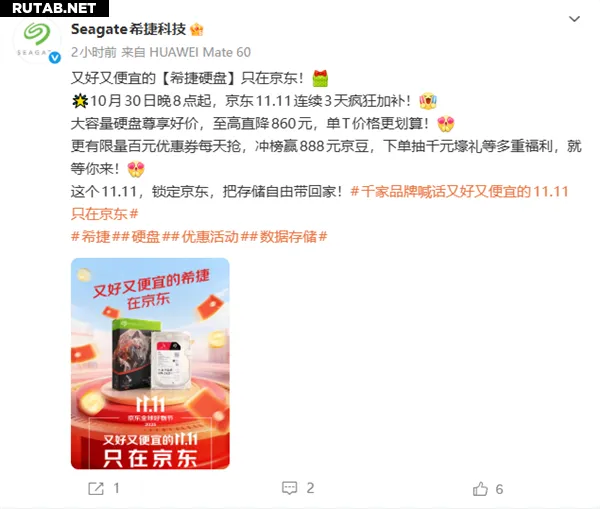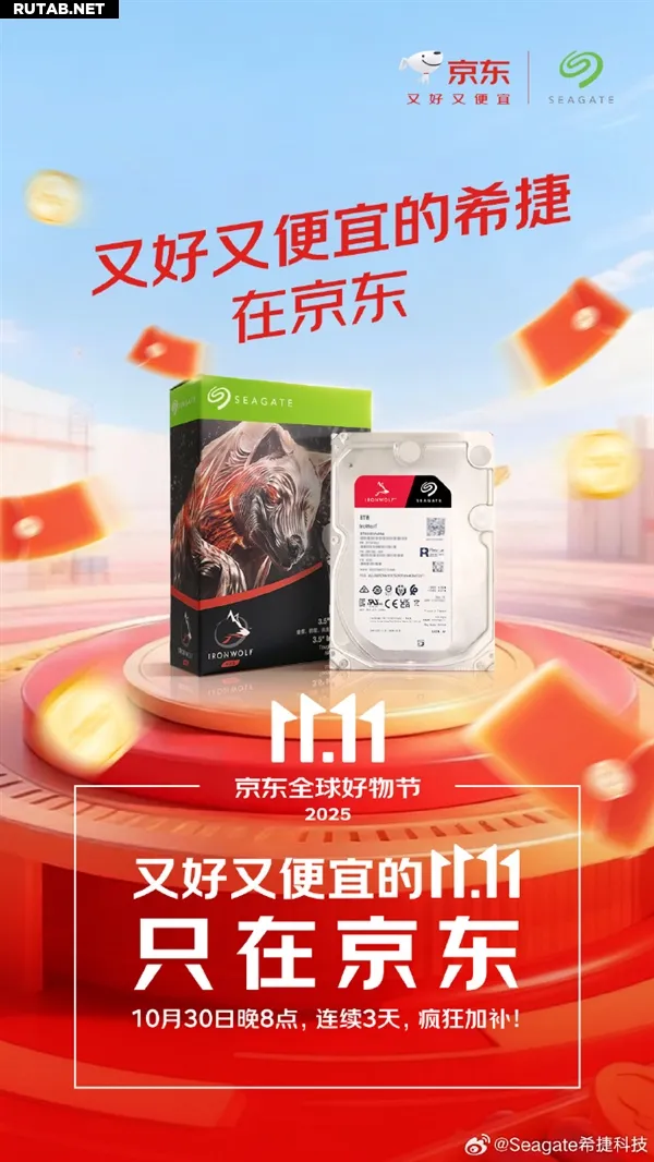 В частности, начиная с 20:00 30 октября по пекинскому времени (15:00 мск) JD.com запустит кампанию «Безумное пополнение», которая продлится три дня подряд. В рамках акции будут предлагаться жёсткие диски Seagate большой ёмкости по выгодным ценам со скидками до 860 юаней, что дополнительно снизит стоимость за терабайт.