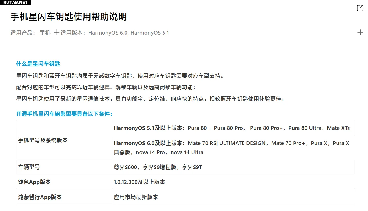 Huawei обновила на своем сайте инструкцию по использованию StarLink Car Key, где указано, что после обновления до HarmonyOS 6.0 функцию можно активировать на следующих моделях: Mate 70 RS, Mate 70 Pro+, Pura X, Pura X Collector's Edition, nova 14 Pro и nova 14 Ultra.