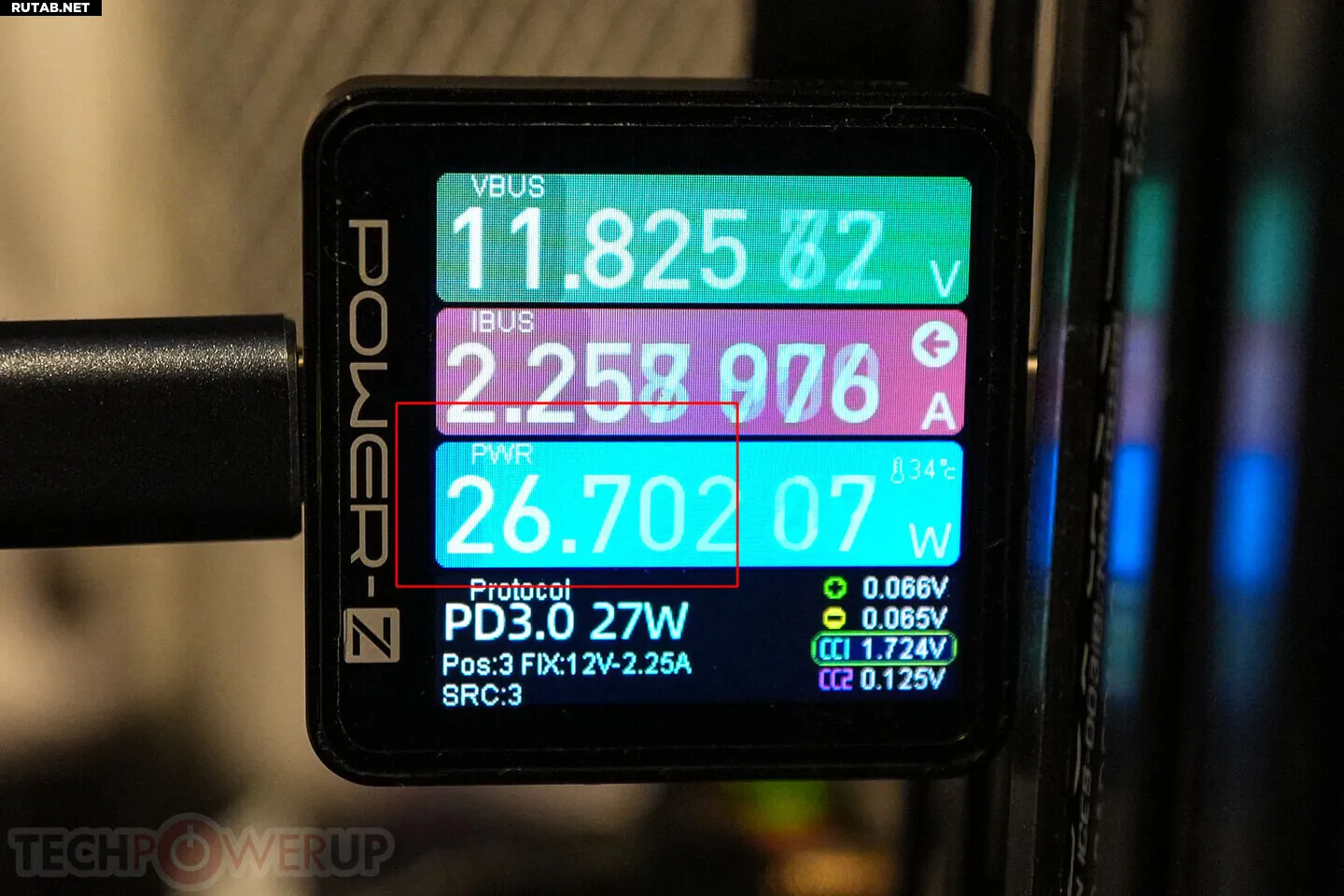 Хотя порт не поддерживает передачу данных USB, он подключен для DisplayPort и подачи питания. Это теоретически позволяет подключать некоторые мониторы, которые используют одно USB-C соединение как для видеовхода, так и для питания. Мы протестировали эту функцию, чтобы убедиться, что она подает на порт достаточную мощность. С помощью USB-C измерителя мощности мы зафиксировали выходную мощность 27 Вт от видеокарты AMD Radeon RX 7900 XTX. Примечательно, что карта может подавать полную мощность на порт даже без установленного драйвера, как было продемонстрировано в нашем тесте. Установка последнего драйвера не меняет это поведение, что указывает на то, что первоначальный список изменений драйвера был просто неверным.