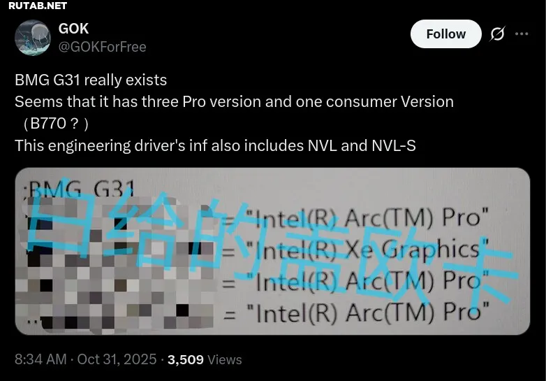 Будущее видеокарты Intel Arc B770 уже ставилось под сомнение ранее в этом году, ещё до того, как Intel и NVIDIA объединились для создания, по словам Intel, «взаимодополняющих» решений для графических процессоров. Всё-таки сообщения ещё в марте 2025 года утверждали, что проект высокопроизводительного GPU Battlemage был отменён ещё в 2024 году. Однако недавно появились слухи о потенциальном выходе видеокарты Intel Arc B770 в конце 2025 года. Теперь недавняя находка в инженерном графическом драйвере Intel (опубликованная @GOKForFree в X, бывший Twitter), похоже, подтверждает теорию о том, что у Intel может быть ещё одна видеокарта серии Arc Battlemage в запасе.