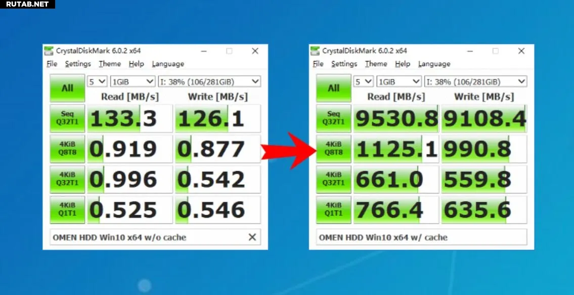 Такие инструменты, как PrimoCache, работают прозрачно для пользователя, автоматически создавая кэш для всего раздела. После выделения части оперативной памяти под кэш для старого HDD производительность 4K-операций действительно резко возрастает, превышая показатели среднебюджетных SSD.
