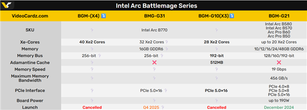 Один из них, BMG-X3 (также известный как BMG-G10), должен был получить 28 вычислительных блоков Xe — промежуточное значение между 32 блоками у BMG-G31 и меньшим числом у BMG-G21. Видеопамять планировалась типа GDDR6 с 192-битной шиной.