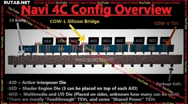 Эта память должна была размещаться на базовом модуле по 3D-технологии, что делало бы GPU сложной чиплетной структурой, напоминающей AMD 3D V-Cache.