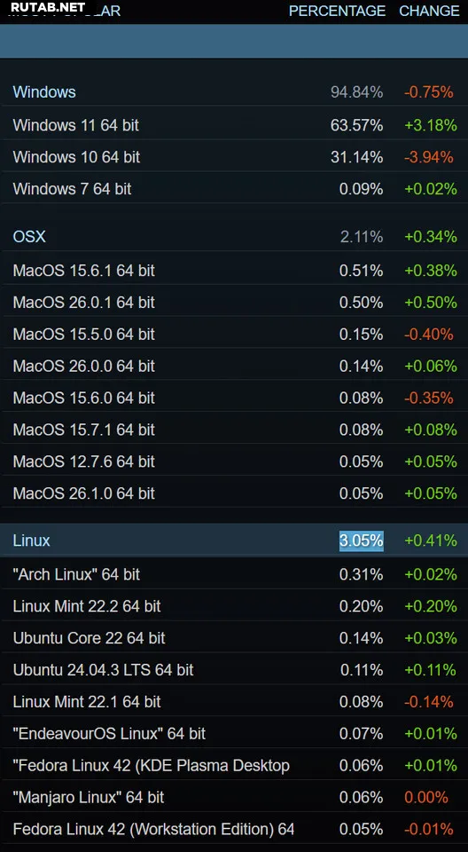 Точный показатель составил 3,05% от всех активных пользователей Steam, которые используют Linux-версию платформы в качестве DRM. Это означает рост на 33% в годовом исчислении по сравнению с октябрём 2024 года, когда на Linux приходилось 2% пользователей. Благодаря этому рост Linux обогнал долю macOS, которая сейчас составляет 2,11%.