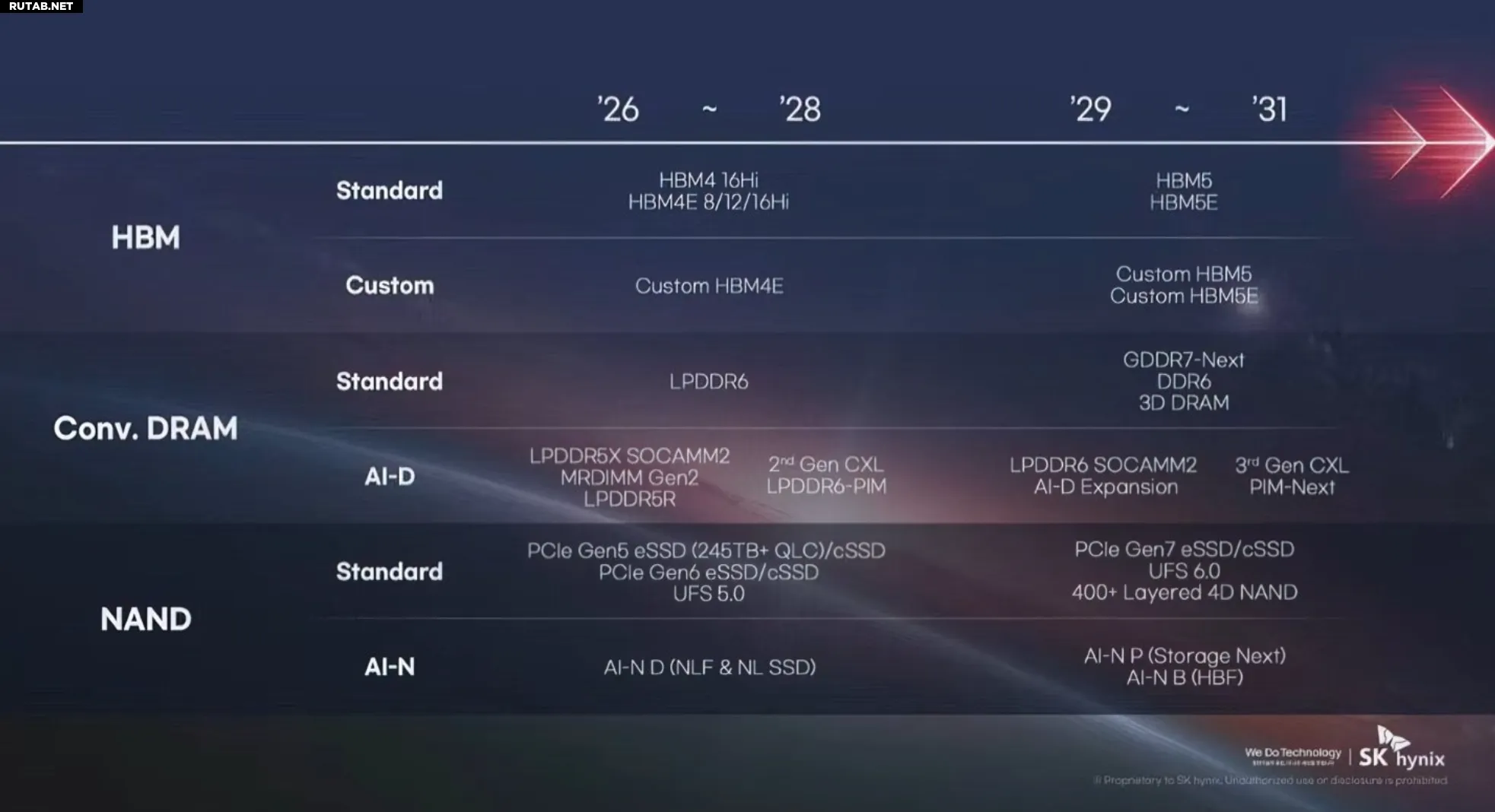 Компания SK Hynix на недавней конференции представила дорожную карту развития чипов памяти. С 2026 по 2028 годы ожидается развитие существующих стандартов HBM, DDR, LPDDR и NAND, но с 2029 по 2031 год на рынок выйдет целая волна продуктов с совершенно новыми технологиями.