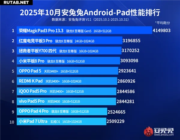 Опубликован официальный рейтинг производительности Android-планшетов от AnTuTu за октябрь 2025 года. Honor MagicPad3 Pro 13.3 возглавил список со средним результатом в 4 149 803 балла, став самым производительным Android-планшетом месяца.