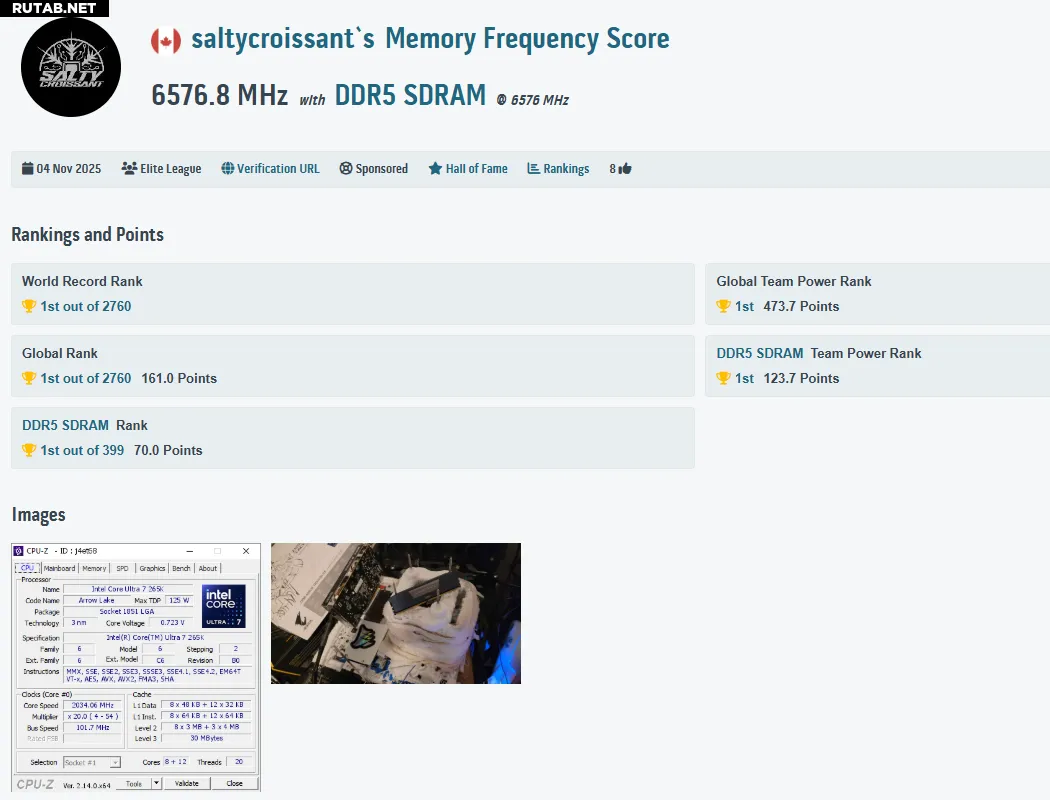 Позавчера оверклокер Hicookie установил новый рекорд — 13034 МТ/с, но почти сразу же его результат превзошёл CENS с показателем 13040 МТ/с. Однако теперь рекорд снова побит — оверклокер Saltycroissant достиг феноменальной частоты 13153 МТ/с.