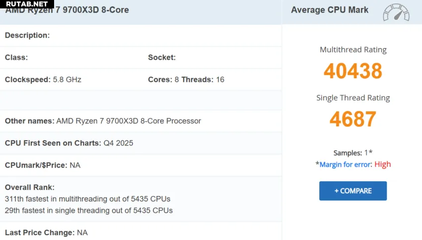 В базе данных тестов PassMark обнаружен новый процессор AMD Ryzen 7 9700X3D