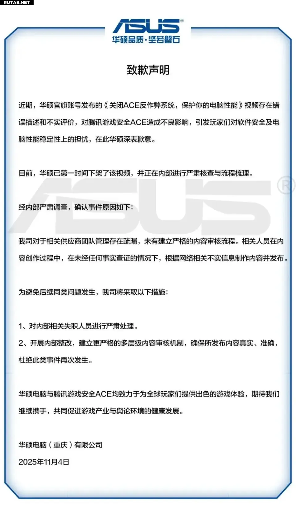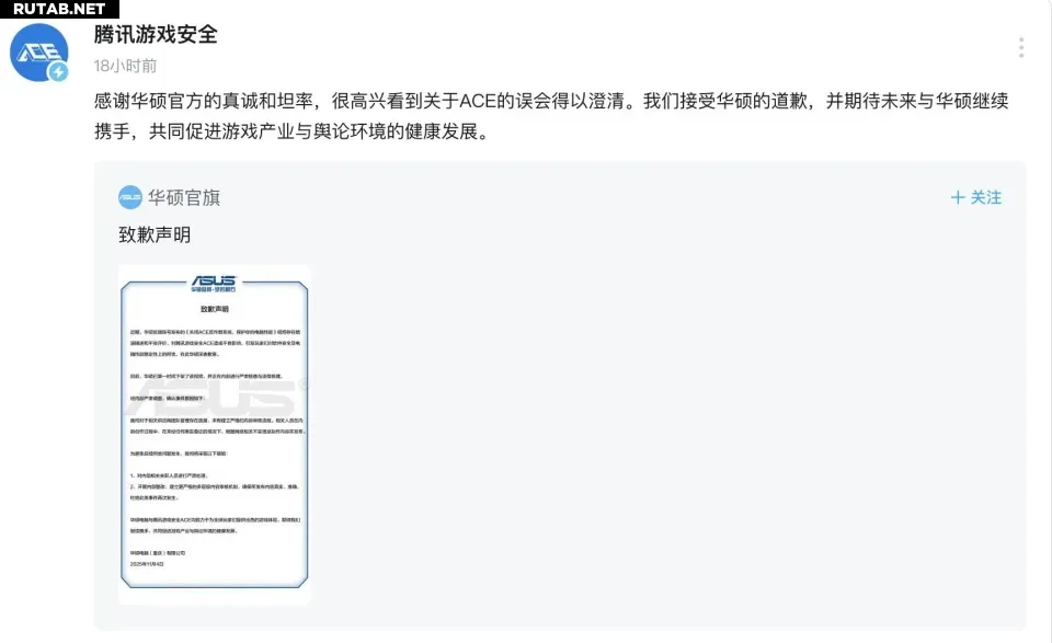 В своём заявлении ASUS признала, что видео «Отключение античитерской системы ACE для защиты производительности вашего компьютера» содержало ошибочные описания и необоснованные оценки. Компания отметила, что этот ролик оказал негативное влияние на восприятие системы безопасности Tencent и вызвал необоснованные опасения игроков относительно стабильности работы ПО.