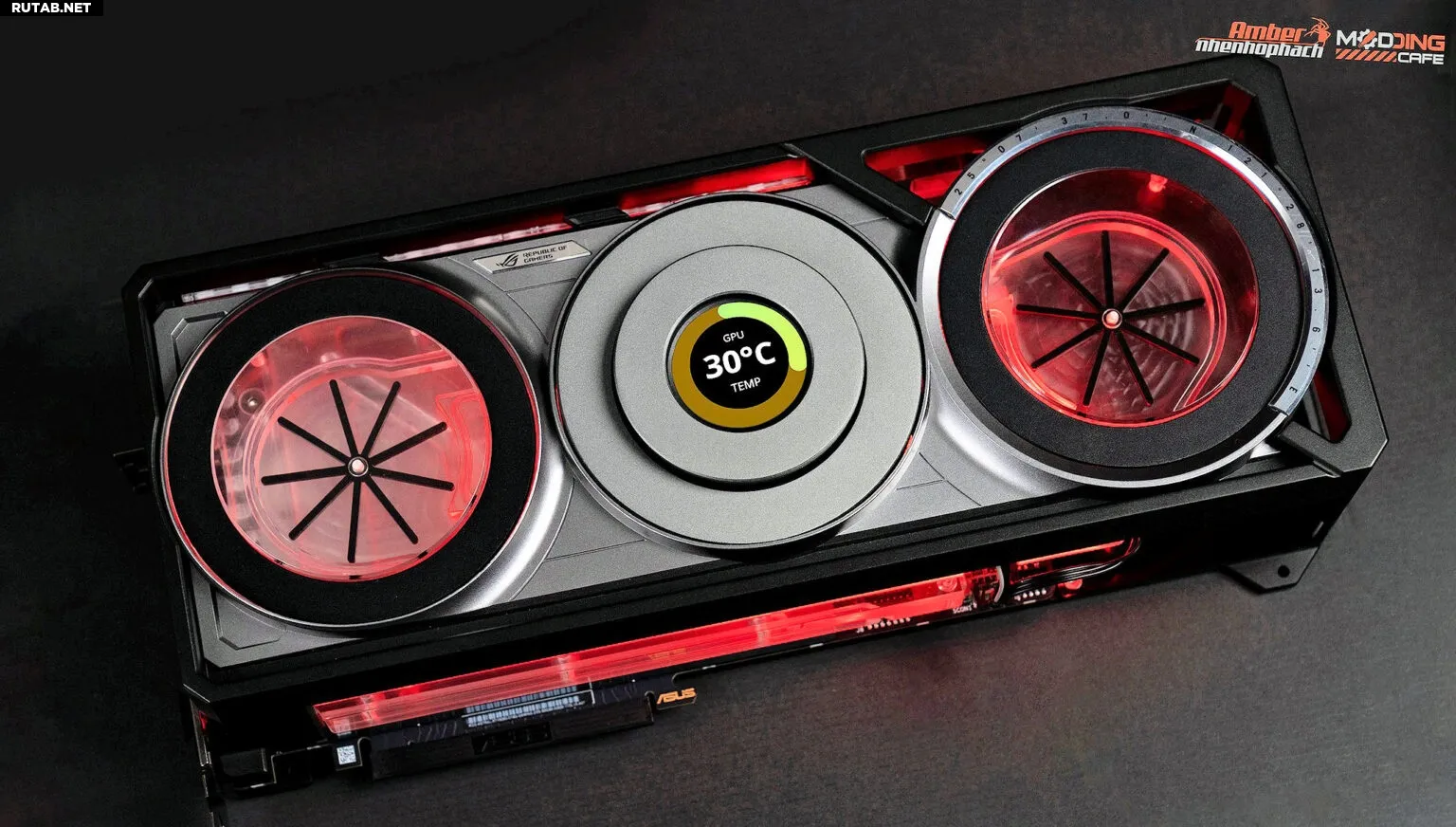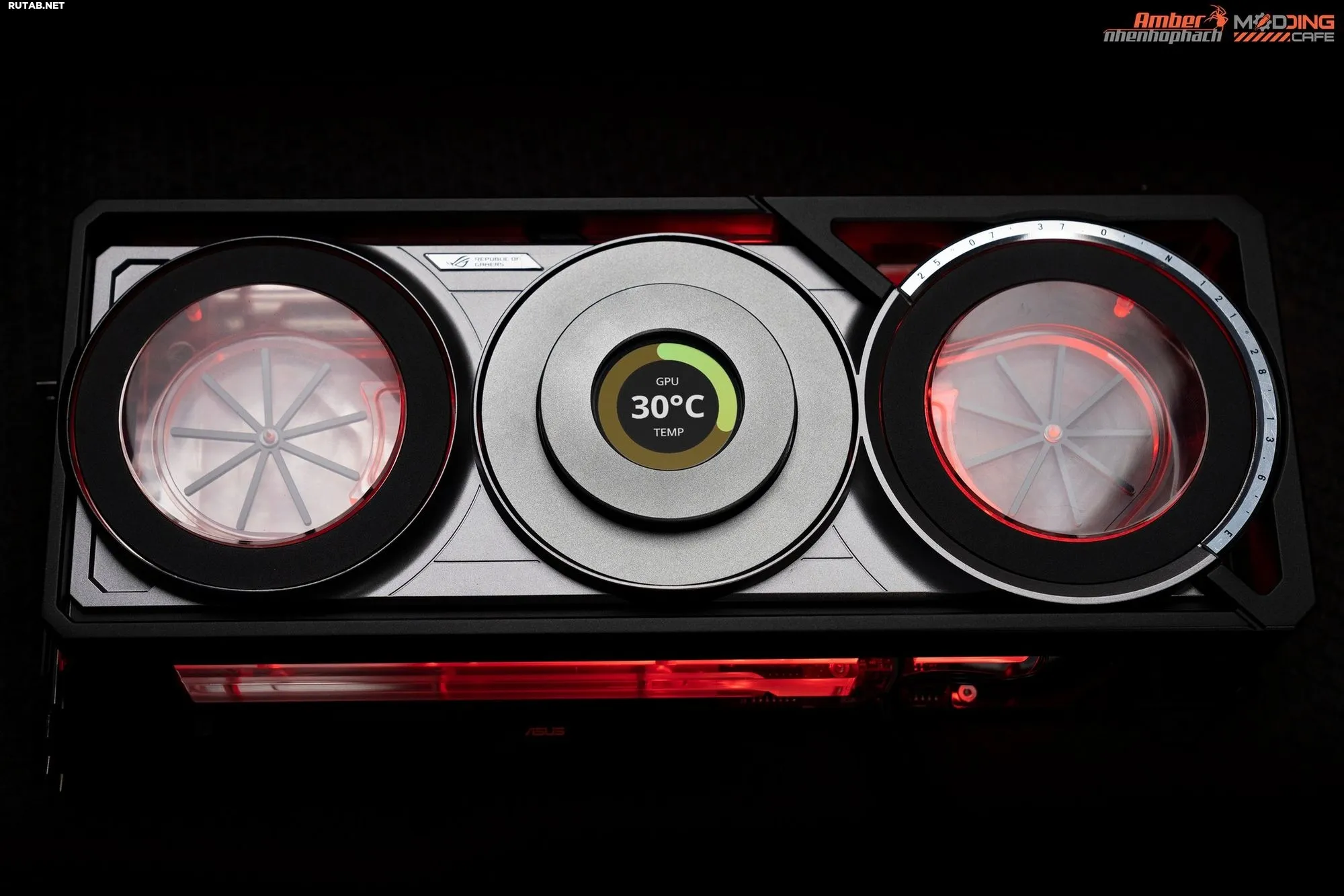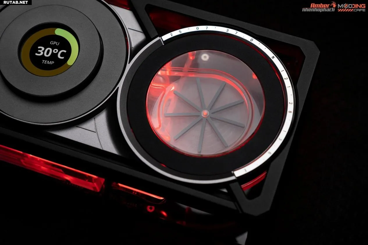На лицевой панели видеокарты три оригинальных вентилятора были заменены на два акриловых окна-резервуара и центральный дисплей, отображающий данные о температуре. К сожалению, фотографии задней части модифицированной видеокарты пока не опубликованы.