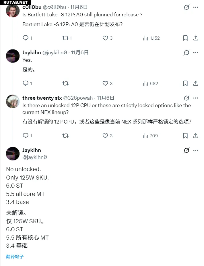 Согласно последней информации от инсайдера Jaykihn, чип «A0» для серии Bartlett Lake-S все еще находится в разработке. Флагманская модель линейки будет использовать чисто P-ядерную архитектуру с максимальным количеством 12 ядер и поддержкой многопоточности, обеспечивая 24 потока выполнения.
