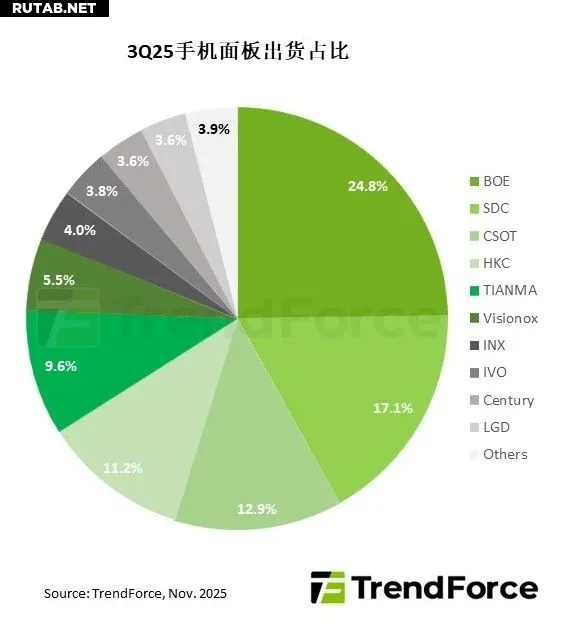 Поставки AMOLED-панелей для смартфонов в третьем квартале достигли 246 миллионов единиц, увеличившись на 9,9%. Расширение использования AMOLED-экранов в моделях среднего ценового сегмента способствует росту их доли на рынке.