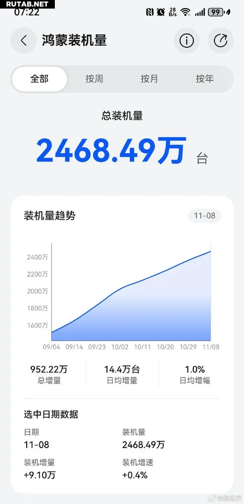 Статистика показывает, что по состоянию на 8 ноября общее число устройств с HarmonyOS достигло 24,6849 млн. Только за этот день парк увеличился на 91 тысячу устройств, при этом среднесуточный прирост составляет 144 тысячи единиц, а темп роста — 1,0%.