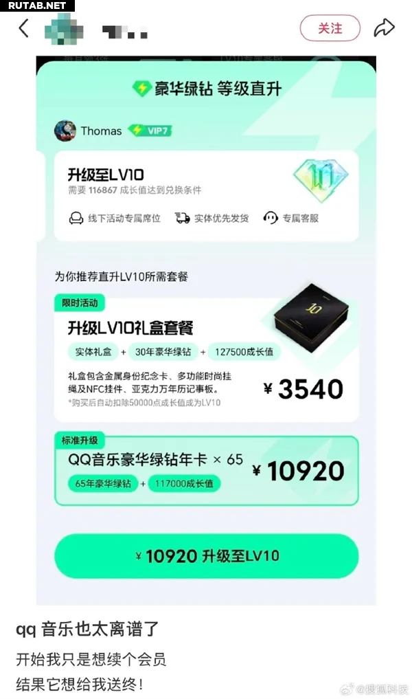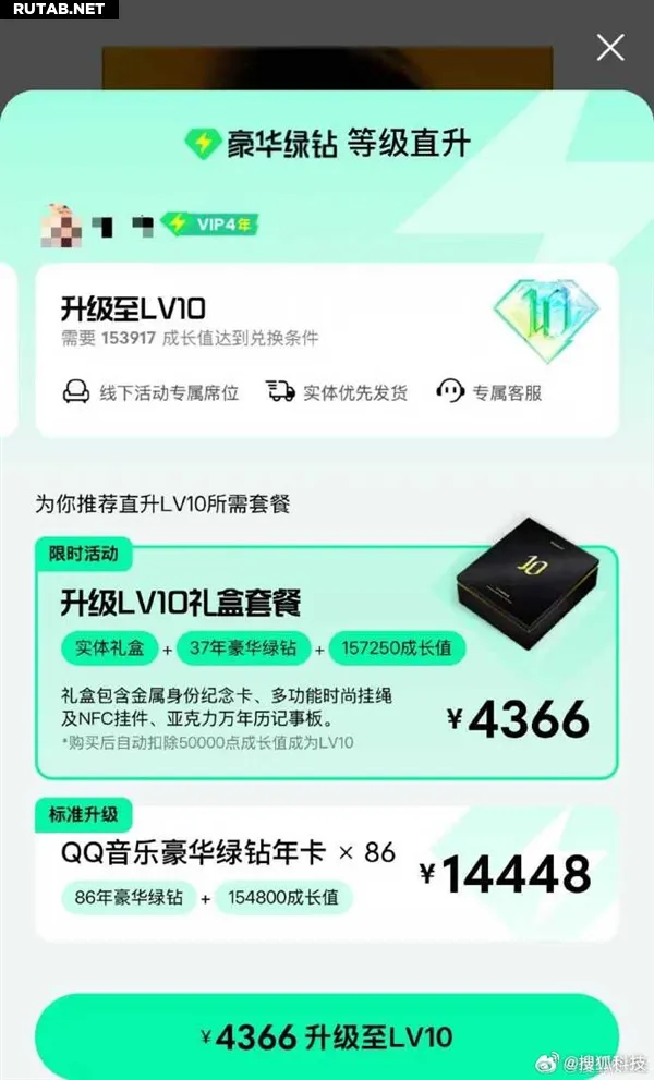 Китайский музыкальный сервис QQ Music запустил услугу мгновенного повышения уровня учетной записи до максимального LV10. Для этого пользователям предлагается приобрести 86 годовых подписок «豪华绿钻» (Deluxe Green Diamond) общей стоимостью 14448 юаней.