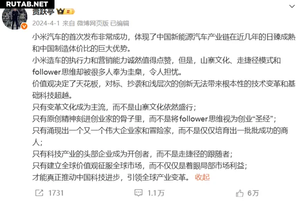 В апреле 2024 года Цзя Юэтин уже высказывался о Xiaomi, отметив в Weibo успешный старт продаж автомобилей Xiaomi и прогресс китайской индустрии электромобилей. Однако теперь он критикует подход компании, заявив, что хотя исполнительские и маркетинговые способности Xiaomi достойны похвалы, их культура «копирования» и стремление идти короткими путями вызывают беспокойство.