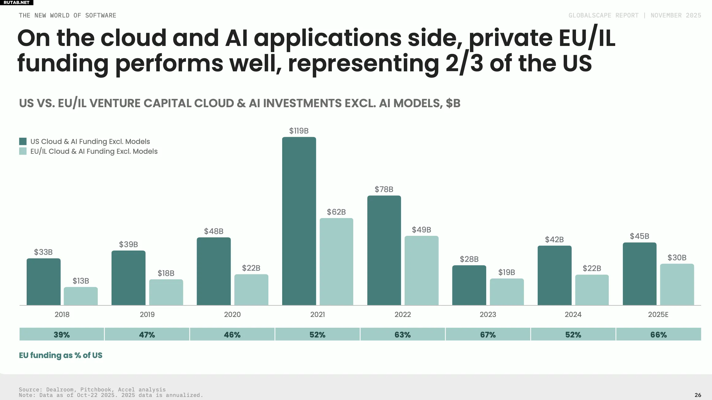 Согласно данным Accel, европейские и израильские компании, работающие в сфере облачных и ИИ-приложений, привлекли в 2025 году 66 центов на каждый доллар, привлечённый их американскими аналогами.